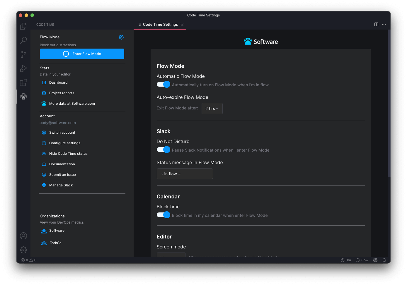 You can automatically block Slack notifications, let your team know you are In Flow with a custom status message, protect focus time on your calendar, and expand your editor to Zen mode.