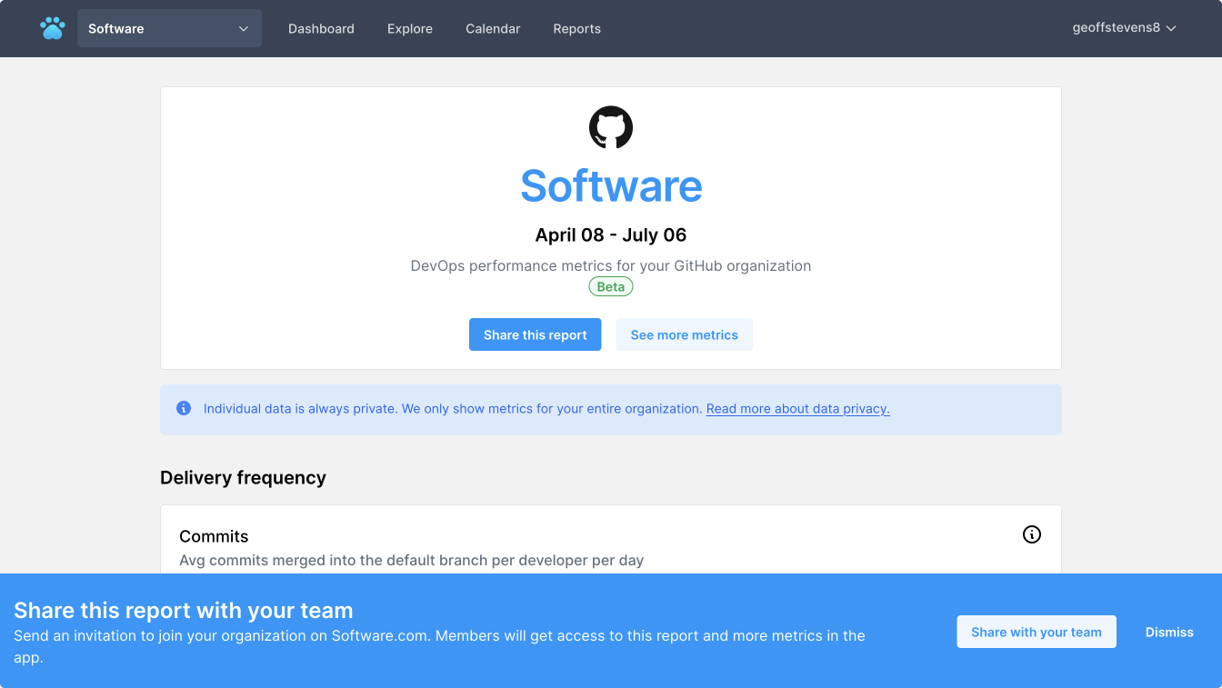 You can get your GitHub report by creating an organization on Software.com.