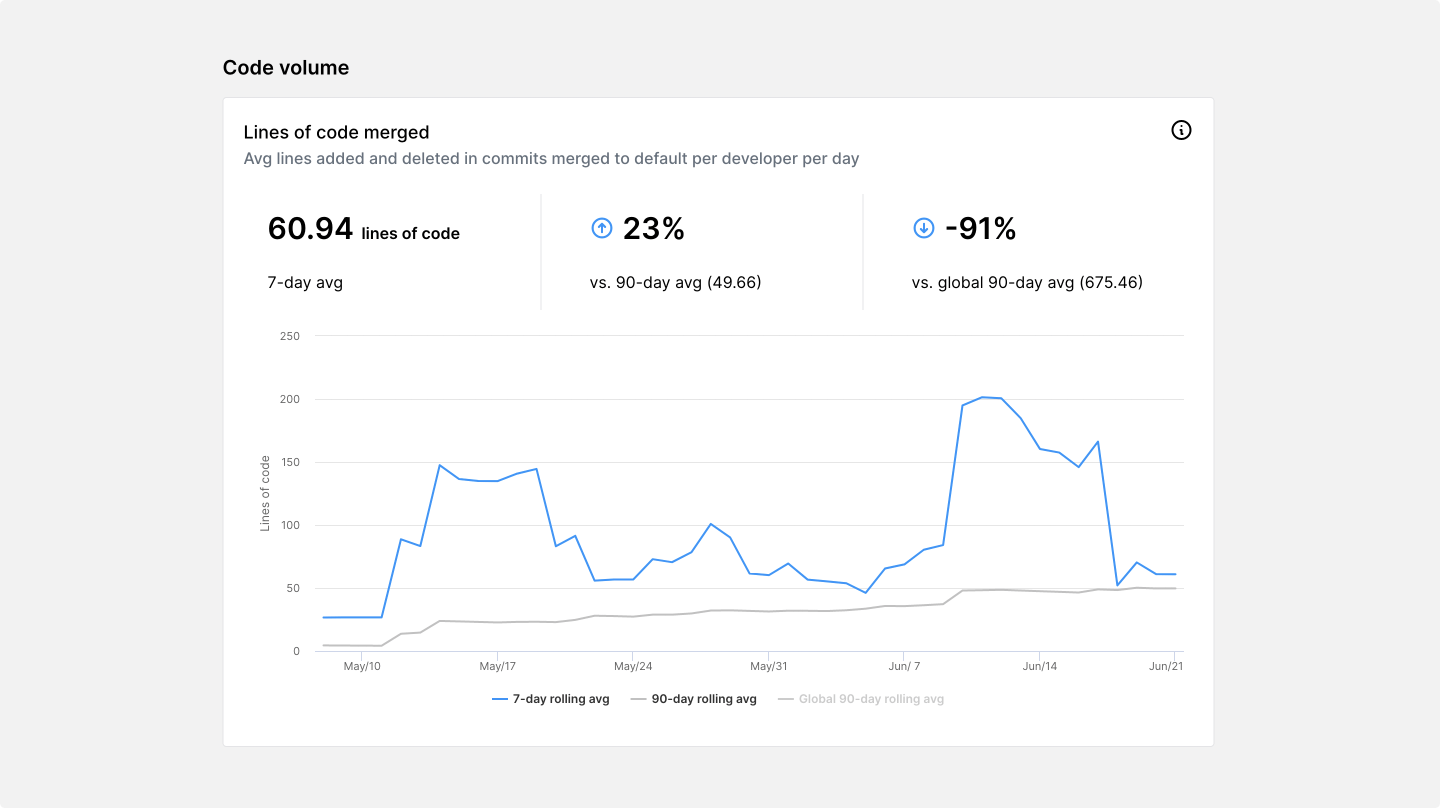 Lines of code merged is just one measure of code volume. When compared with other metrics—such as lead time and commit frequency—you can get a clearer picture of the overall throughput of your engineering system.