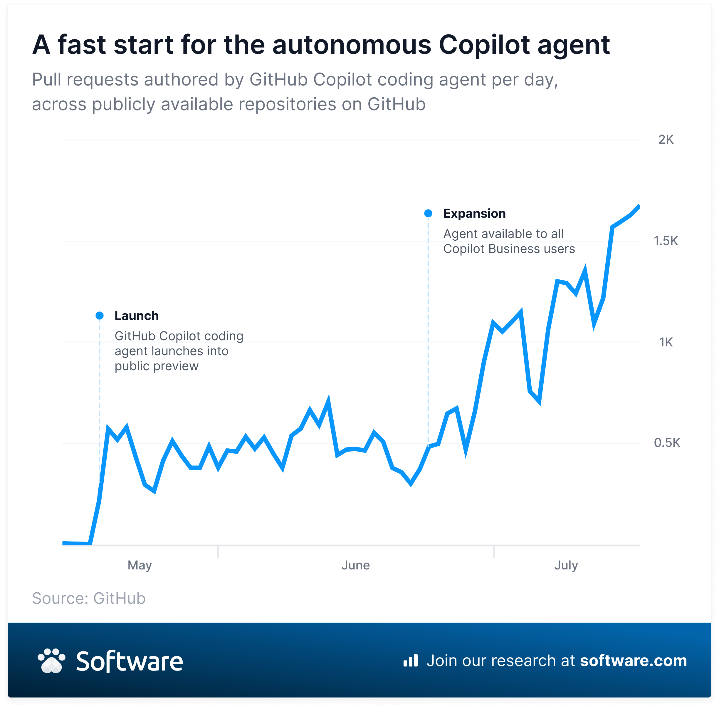 In just a few weeks, GitHub Copilot agent has gone from launch to rapid acceleration. The inflection point in late June, when the agent became available to all Copilot Business users, marks a clear step-change. Since then, the number of pull requests authored by the agent has climbed steeply — surpassing 1,500 per day and still rising.
